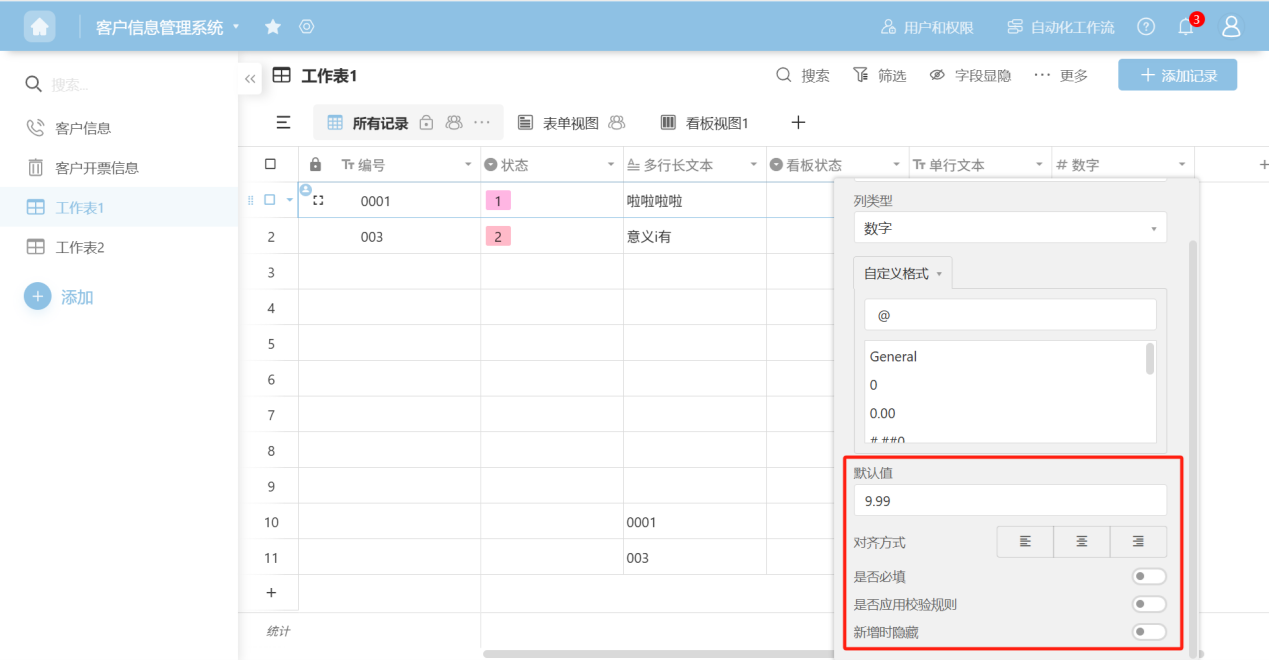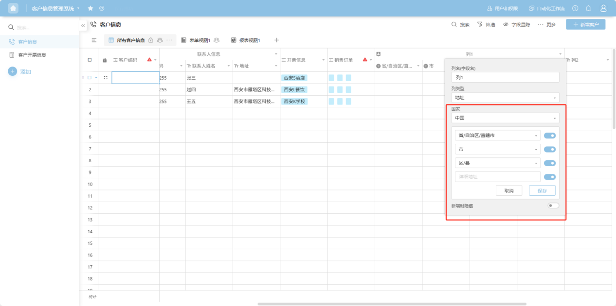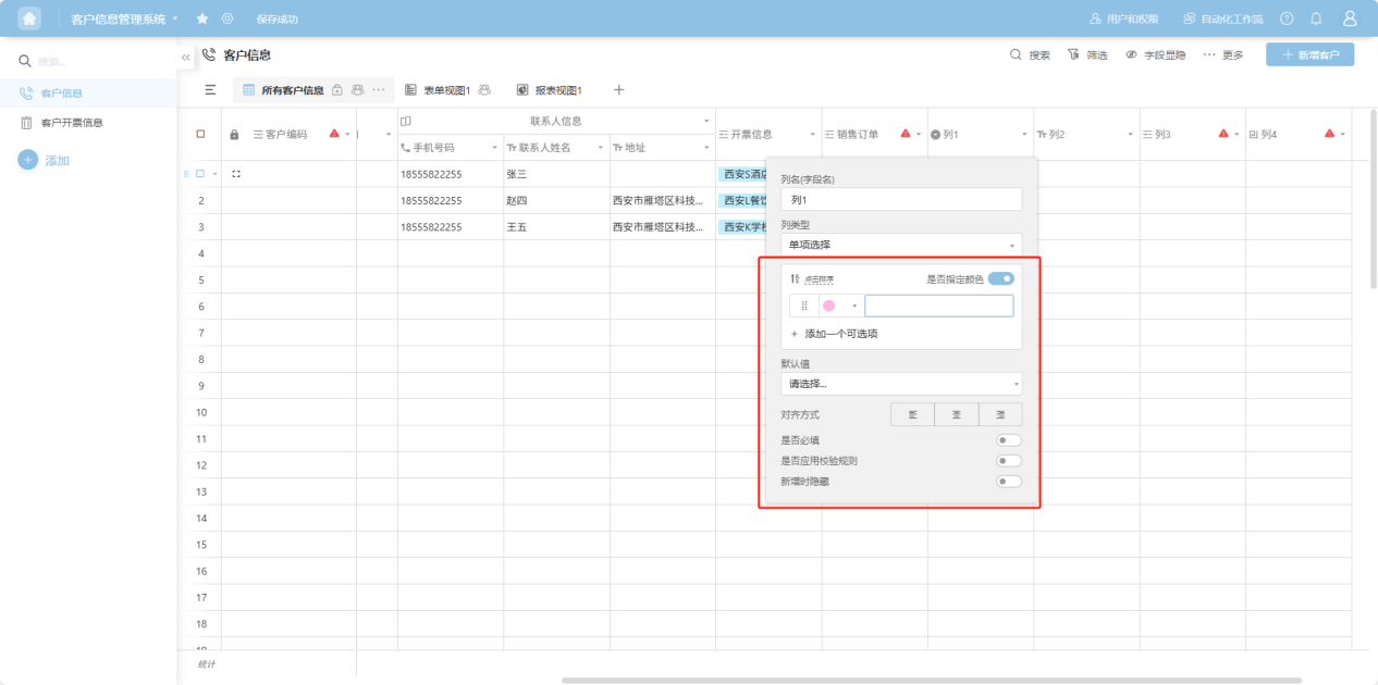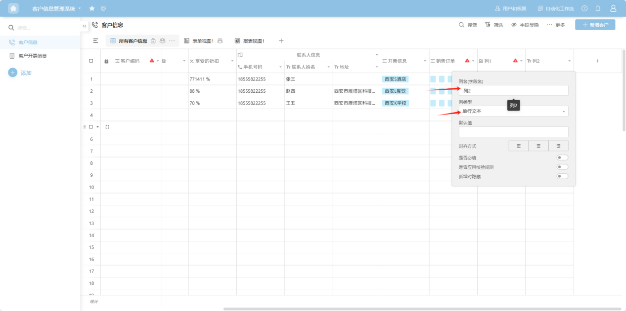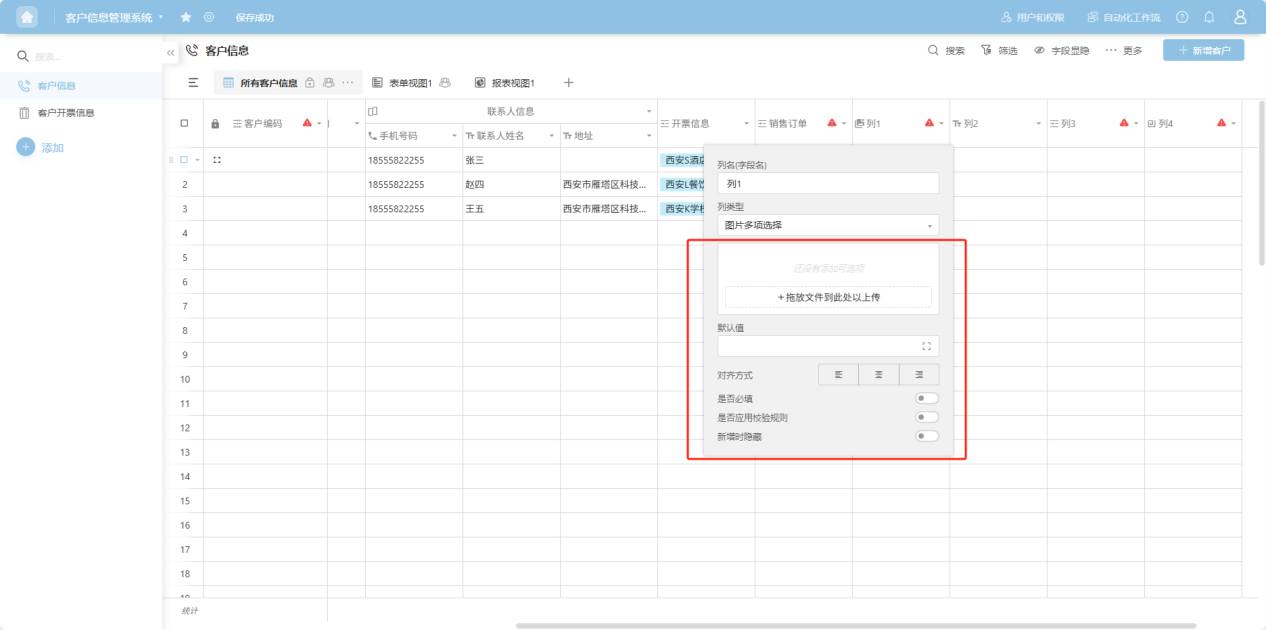 Step 3: In the pop-up column edit box, add a column name, select a column type, and configure the corresponding edit items for that column type. For detailed explanations of each column type, refer to the "1.3 Edit Column Settings" section.