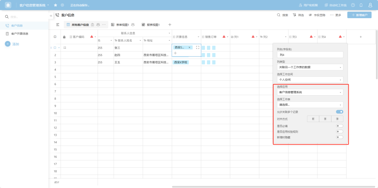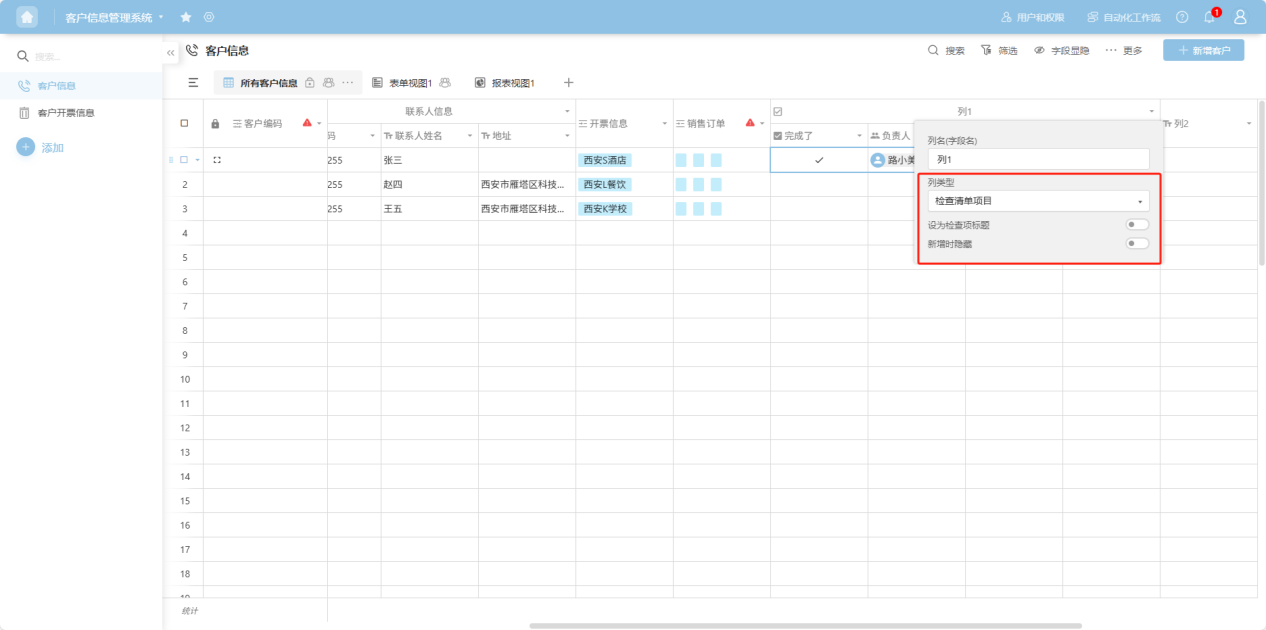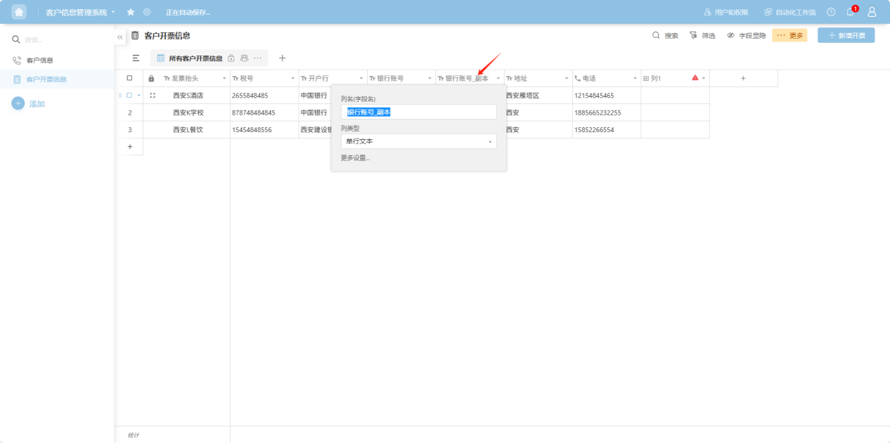 Step 3: The copied column appears as a duplicate to the right of the original column. In the pop-up column edit box, add a column name, select a column type, and configure the corresponding edit items for that column type. For detailed explanations of each column type, refer to the “1.3 Edit Column Settings” section.