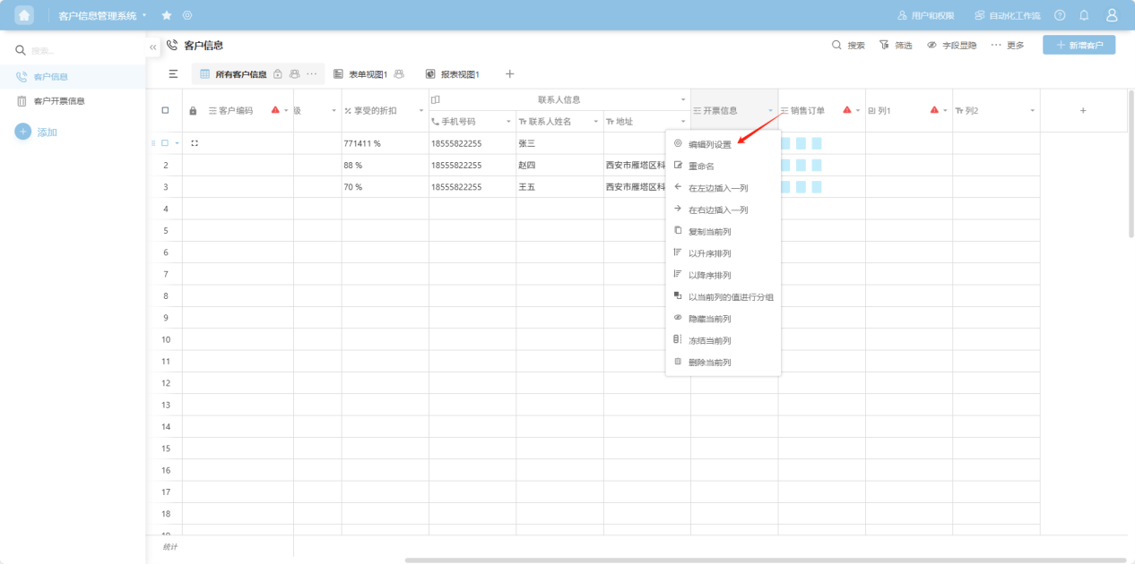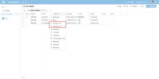 " to the right of the column name, or right-click any cell in that column's data to open the column operation dropdown menu. Select "Insert column to the left/right".