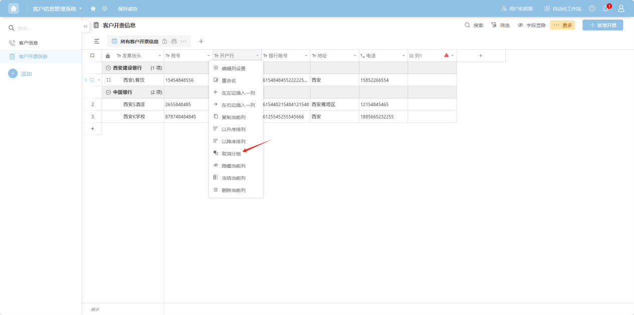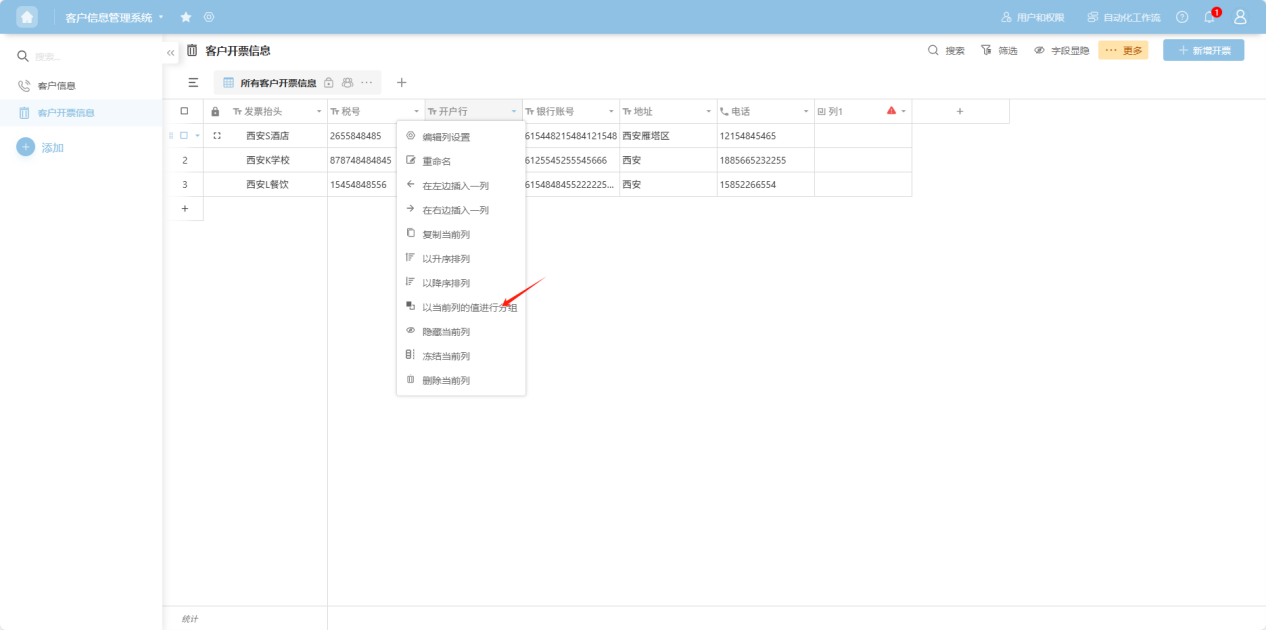 " to the right of the column name, or right-click any cell in that column's data to open the column operation dropdown menu. Select “Group by this column” to complete the action.