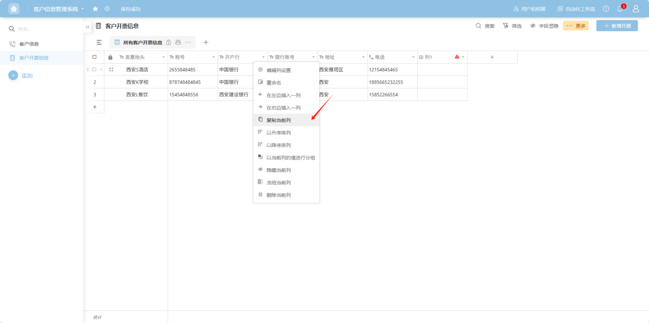 " to the right of the column name, or right-click any cell in that column's data to open the column operation dropdown menu. Select “Copy current column”.