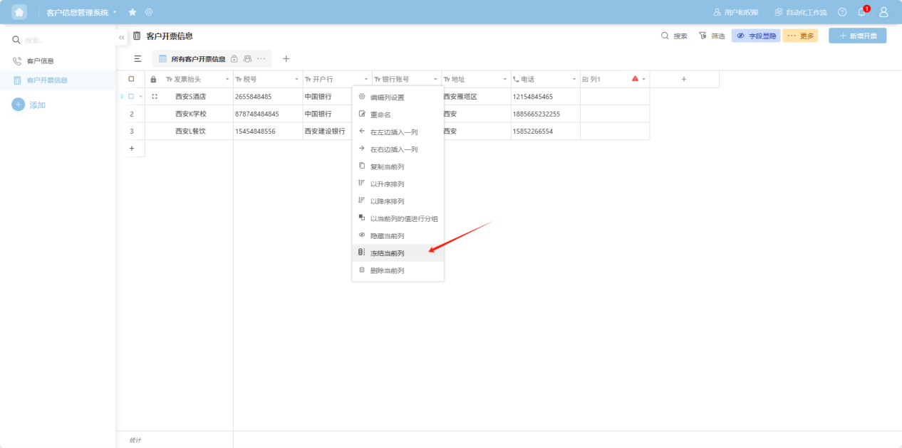" to the right of the column name, or right-click any cell in that column's data to open the column operation dropdown menu. Select “Freeze current column”. The frozen column will be positioned to the left of the freeze line.