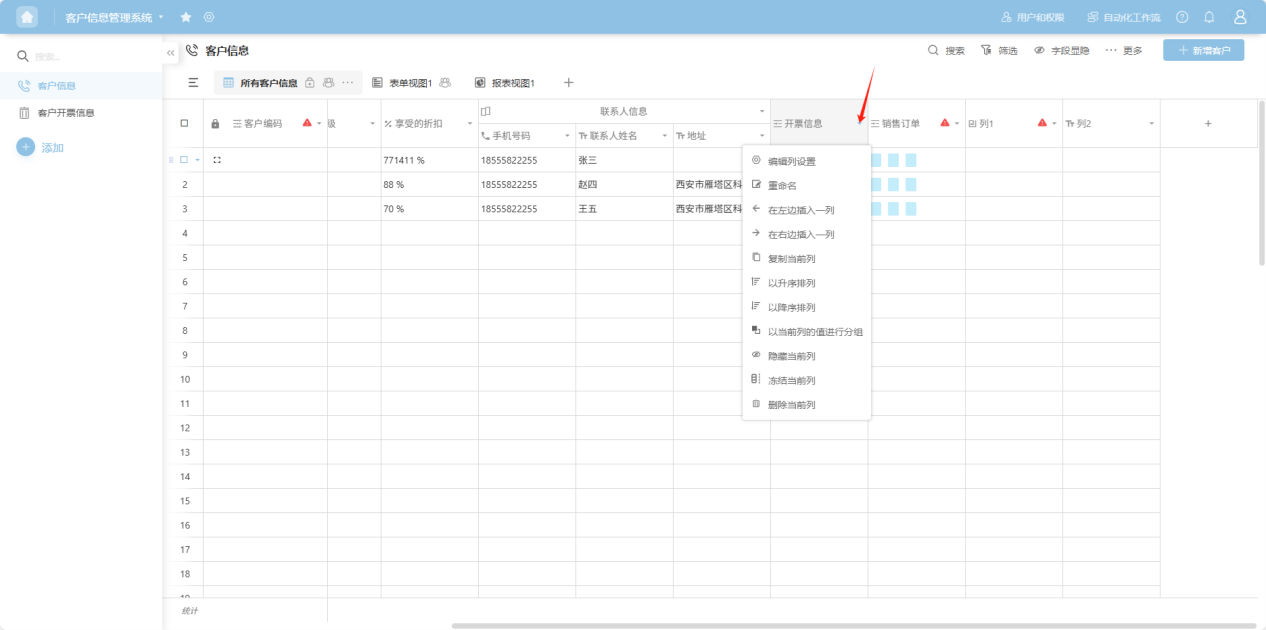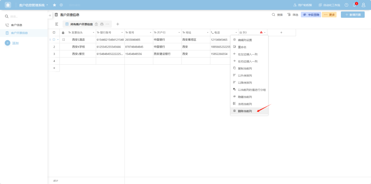 " to the right of the column name, or right-click any cell in that column's data to open the column operation dropdown menu. Select “Delete current column”. After confirming the deletion, the column will disappear from the worksheet. This action cannot be undone, so please proceed with caution!