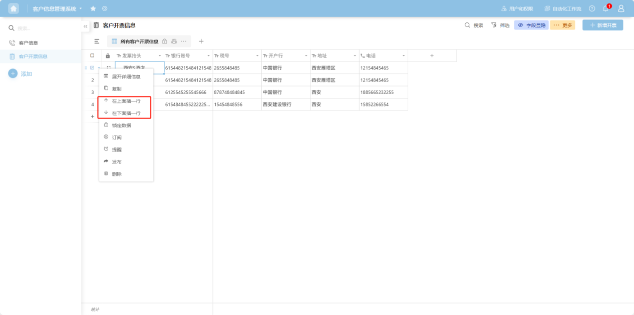 " to the left of the row checkbox, or right-click any cell in that row's data to open the row operation dropdown menu. Select “Insert row above/below” to insert the row.