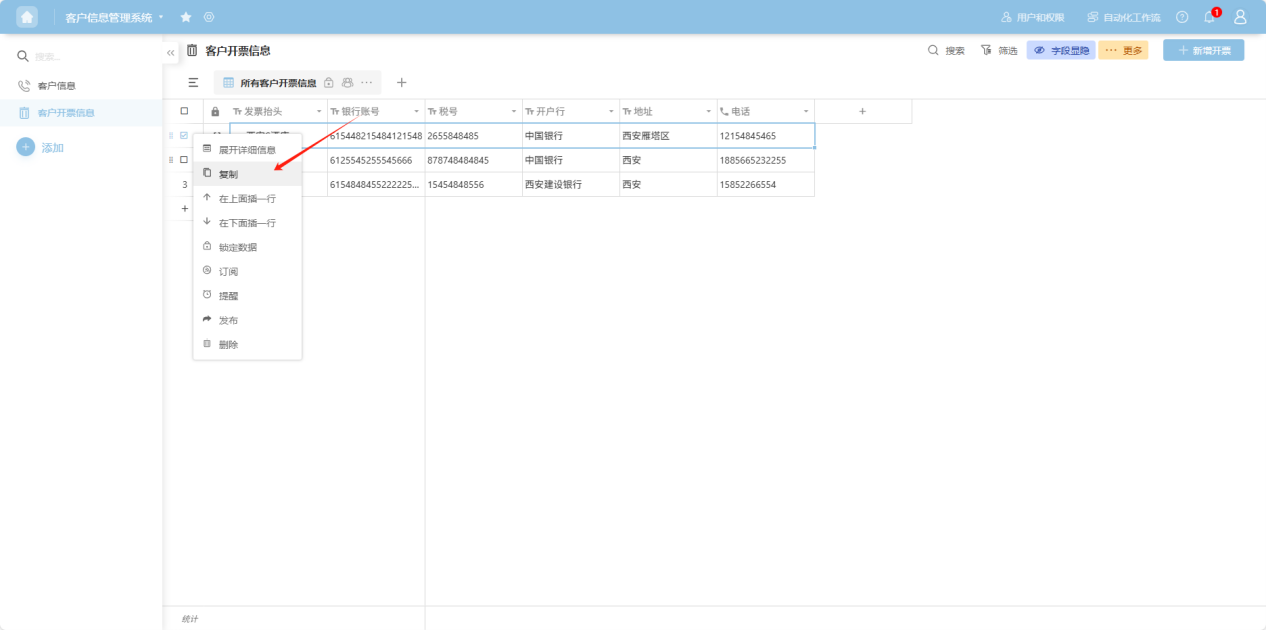 ” to the left of the row checkbox, or right-click any cell in that row's data to open the row operation dropdown menu. Select “Copy”.