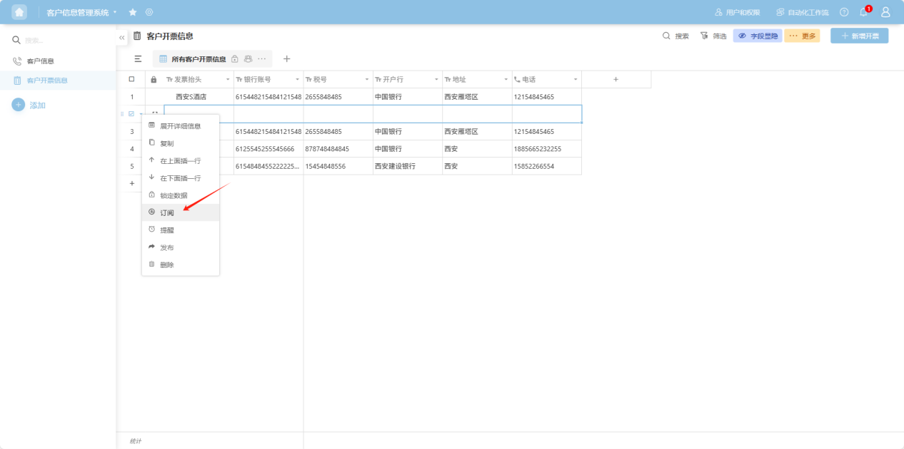 ” to the left of the row checkbox, or right-click any cell in that row's data to open the row operation dropdown menu. Select “Subscribe”. Alternatively, in the “Row Details” view, click the “