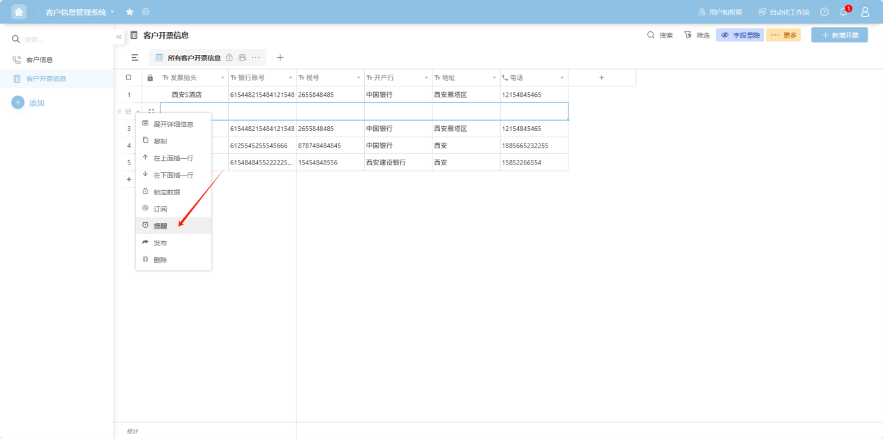 ” to the left of the row checkbox, or right-click any cell in that row's data to open the row operation dropdown menu. Select “Set reminder”. Alternatively, in the “Row Details” view, click the “