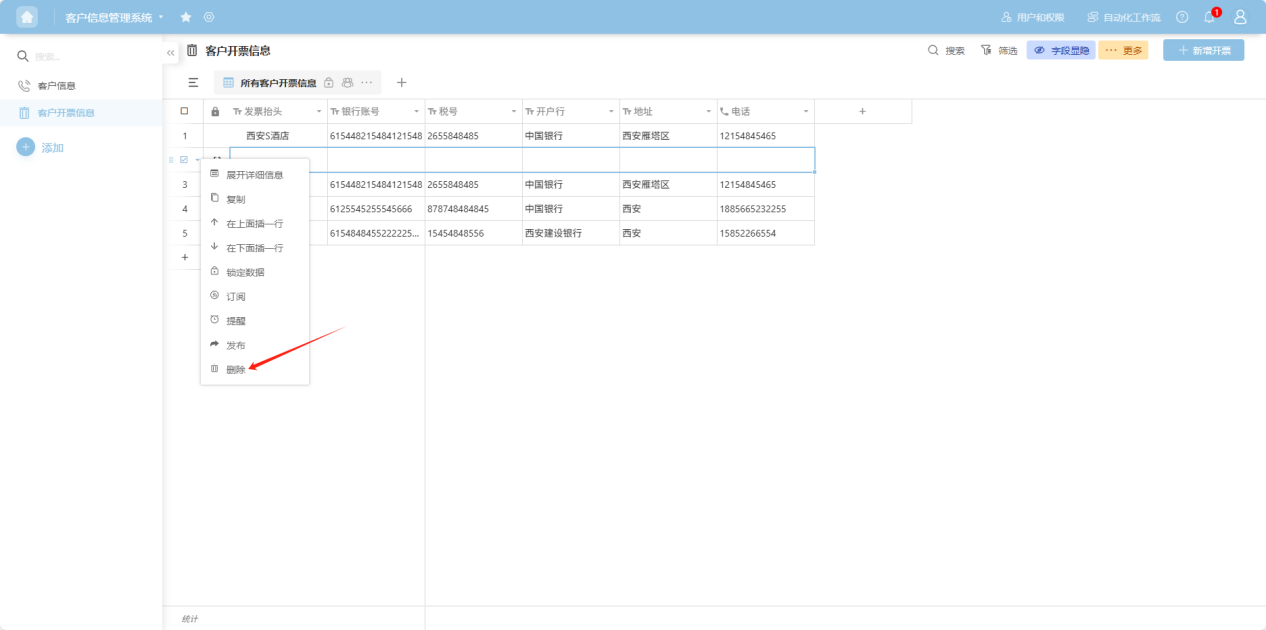 ” to the left of the row checkbox, or right-click any cell in that row's data to open the row operation dropdown menu. Select “Delete”. Alternatively, in the “Row Details” view, click the “