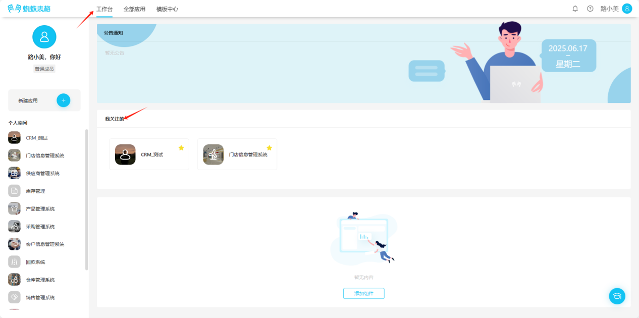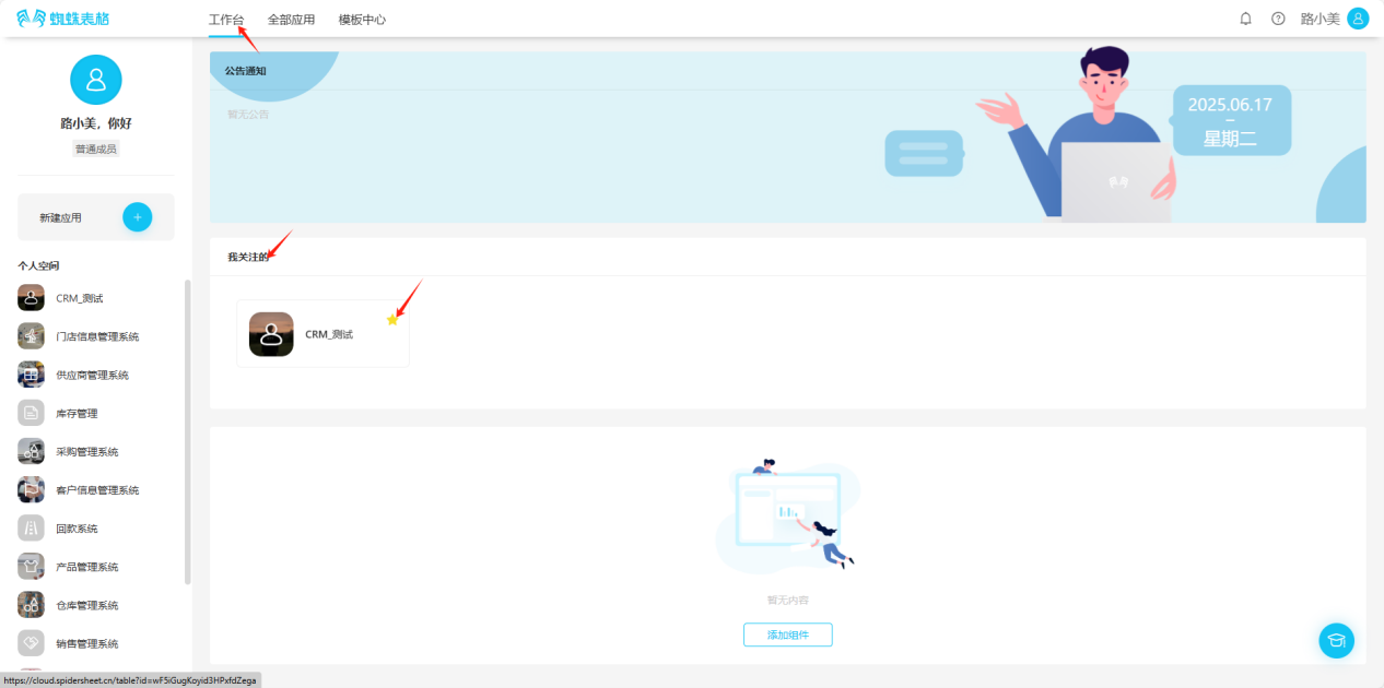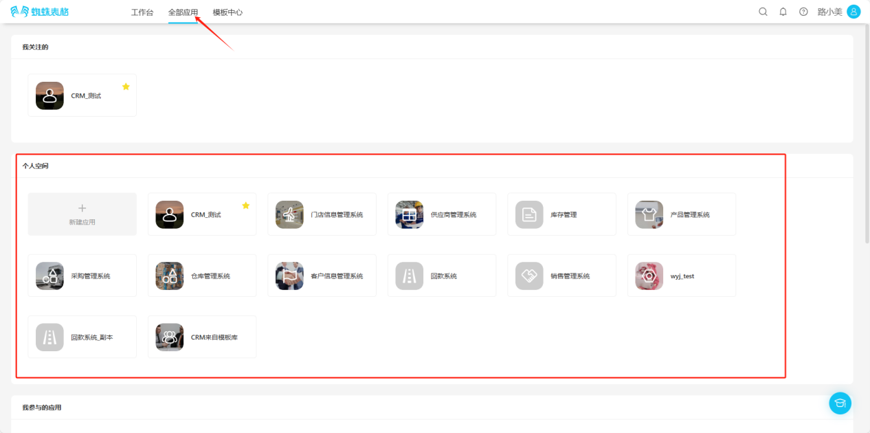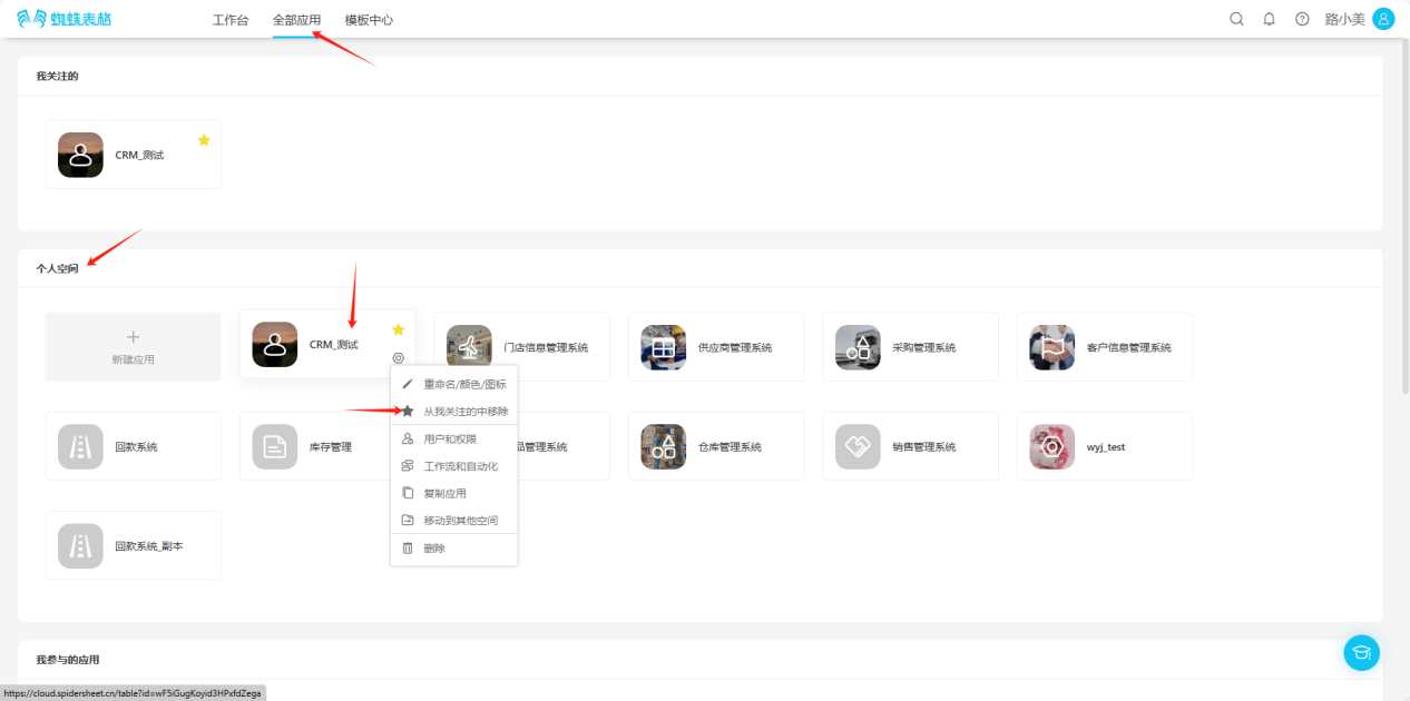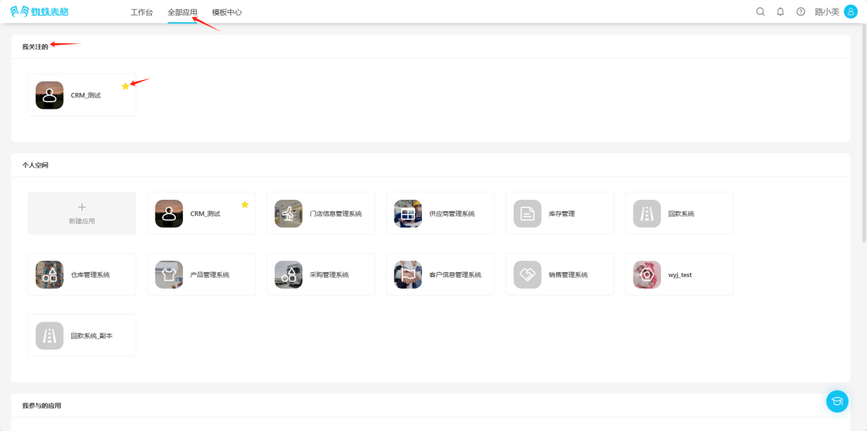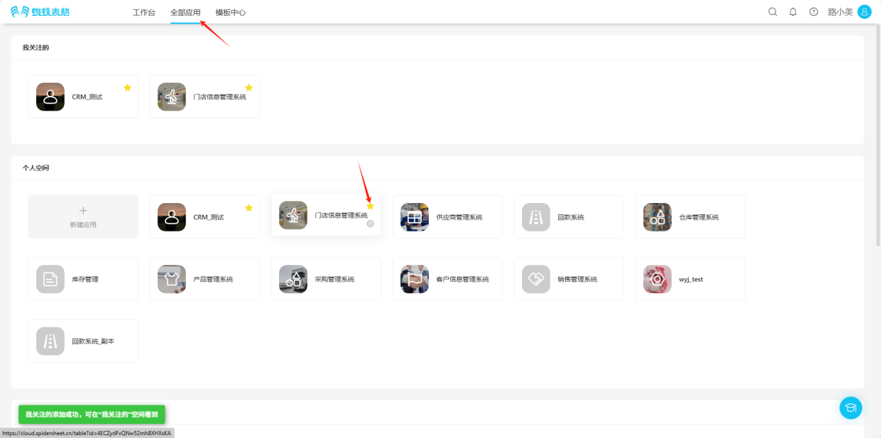 - All Applications → Personal Space → Click the "☆" in the upper right corner of the application you want to follow, the icon changes to "★", indicating successful follow.