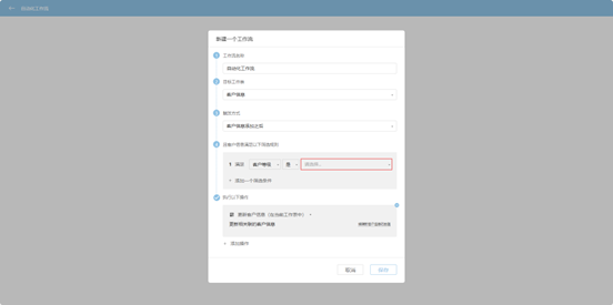 Step 3: In the popup page, sequentially set the workflow name, target table, trigger method, filter rules, and operations to execute.