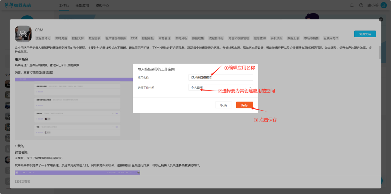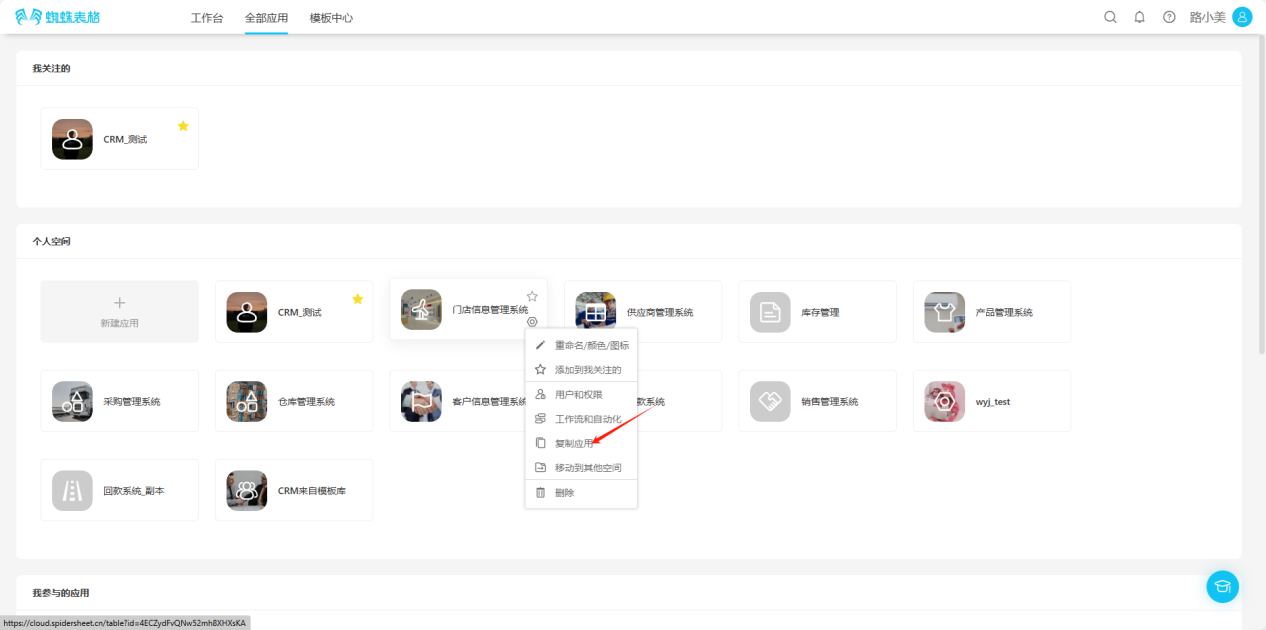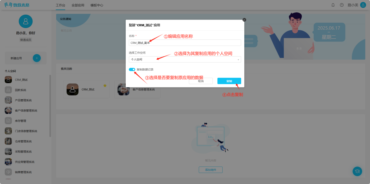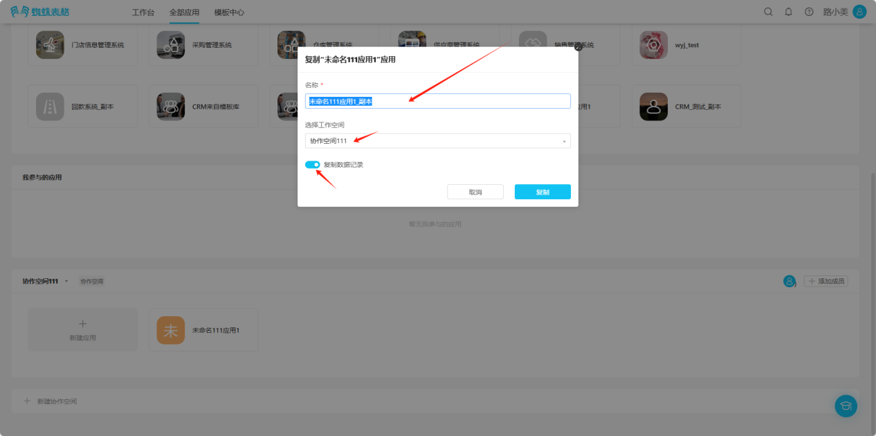 Step 4: In the popup window, edit the application name and space, choose whether to copy data, click "Copy", and wait for installation. The installed template will appear in the corresponding space application list.