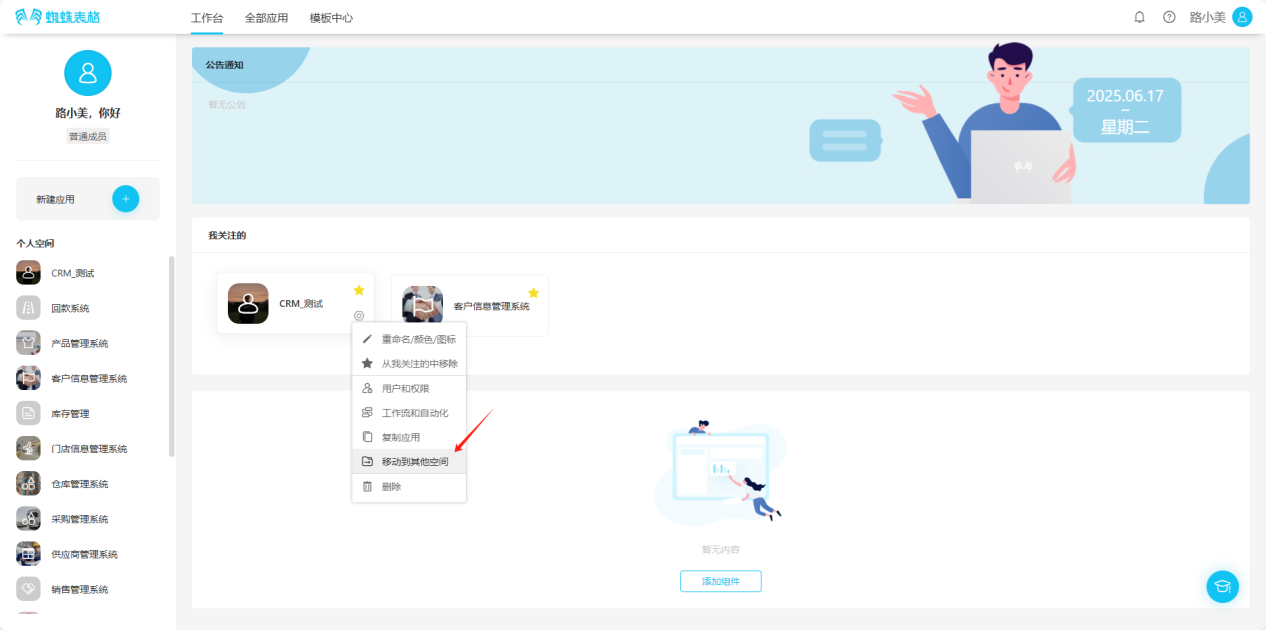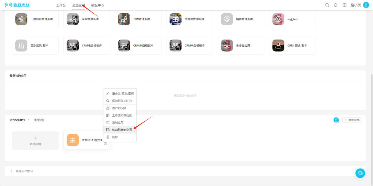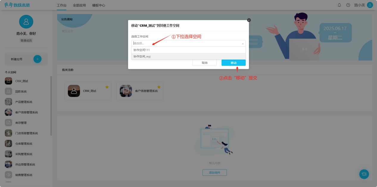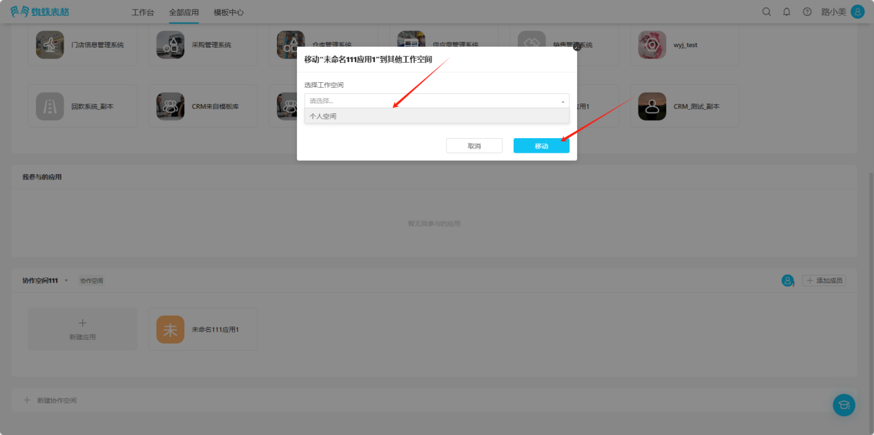 Step 2: In the opened popup, select the space to move to, click "Move" to successfully move. You can view the application in the moved space.