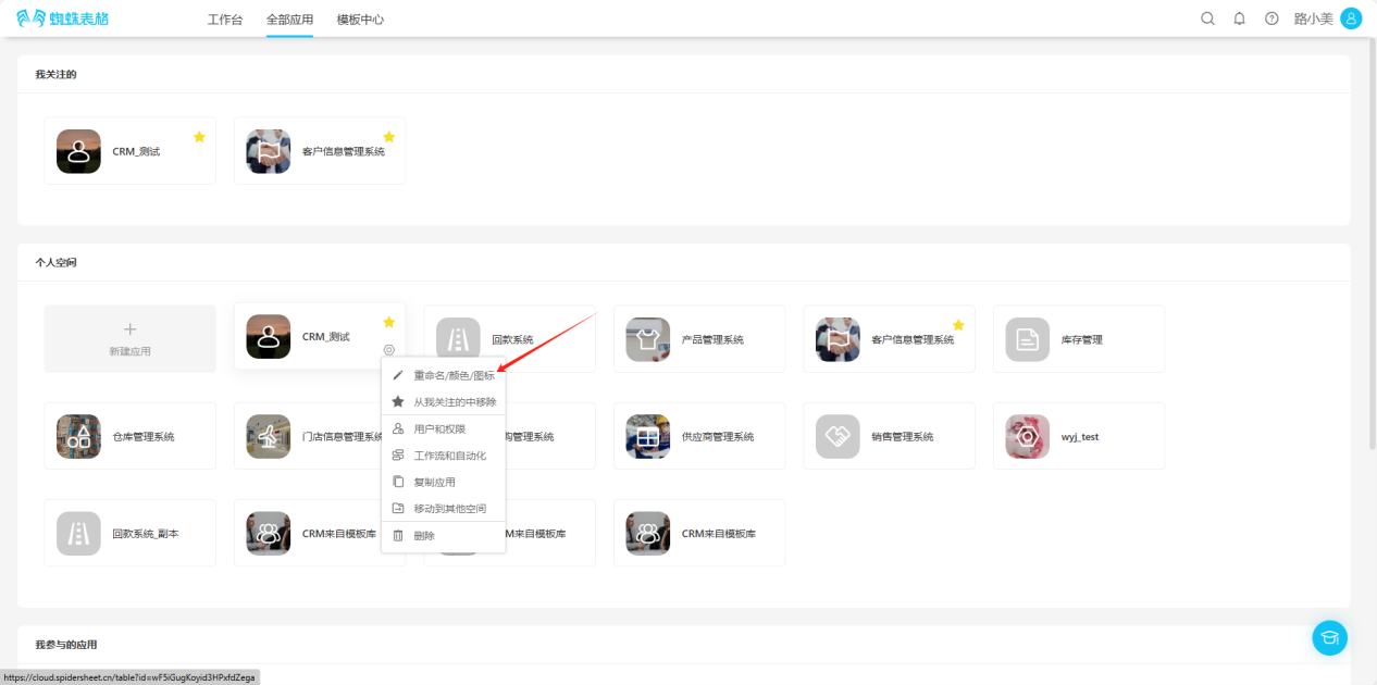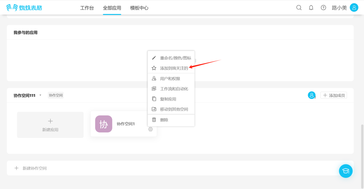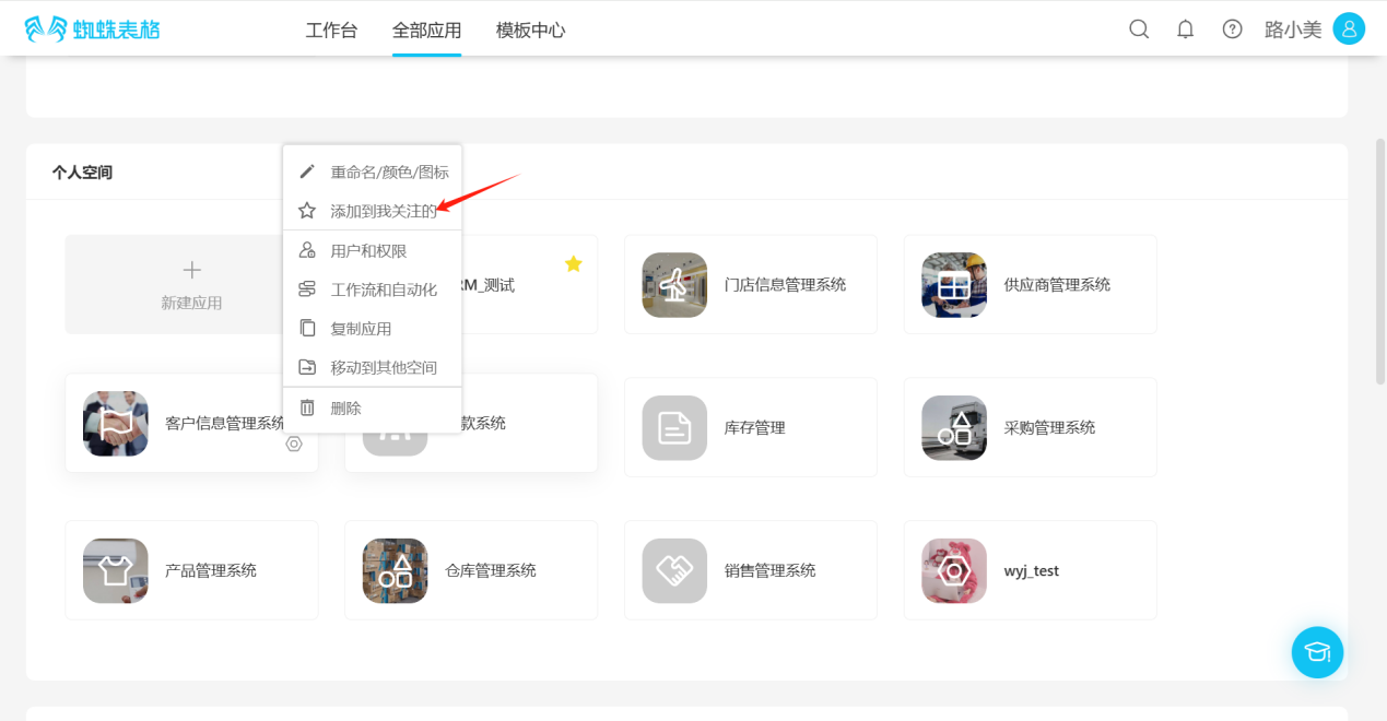 - From the workspace left application list or application cards under all applications, enter the application you want to follow, click the "☆" to the right of the application name, the icon changes to "★", indicating successful follow.