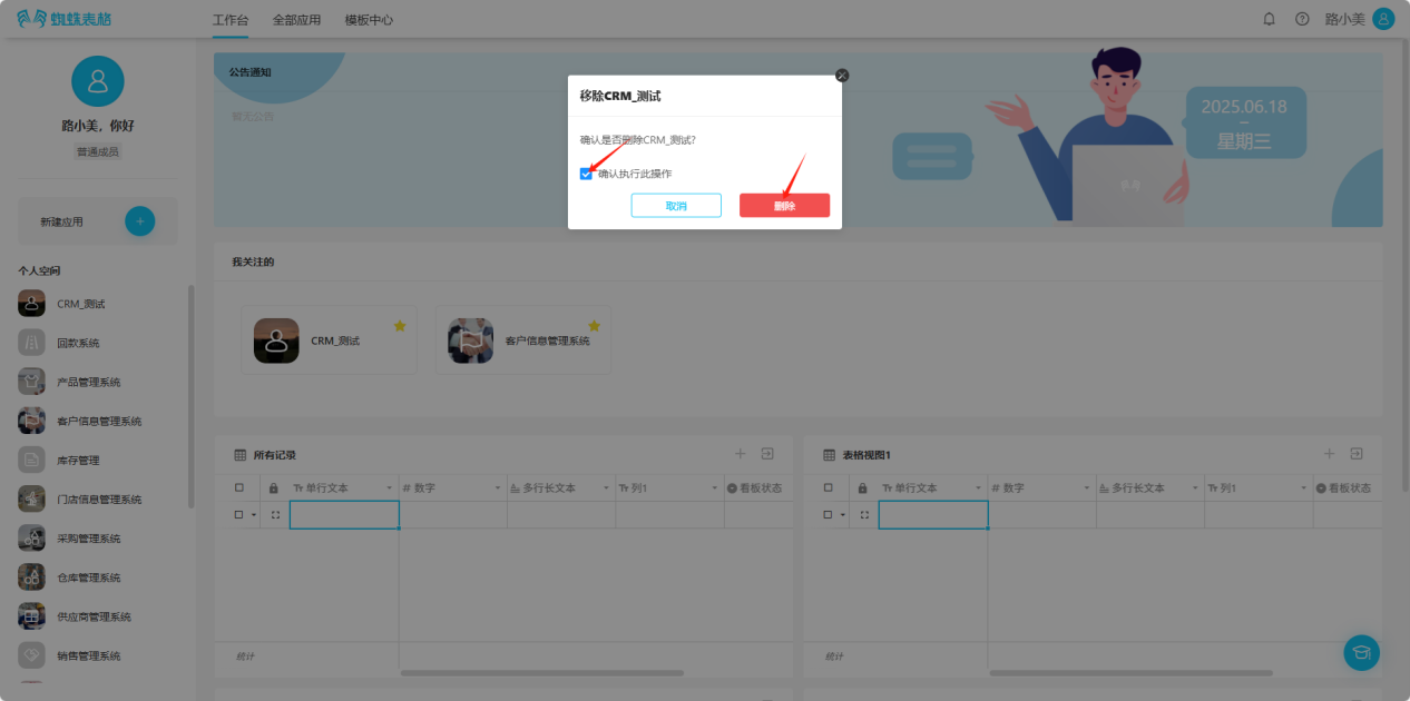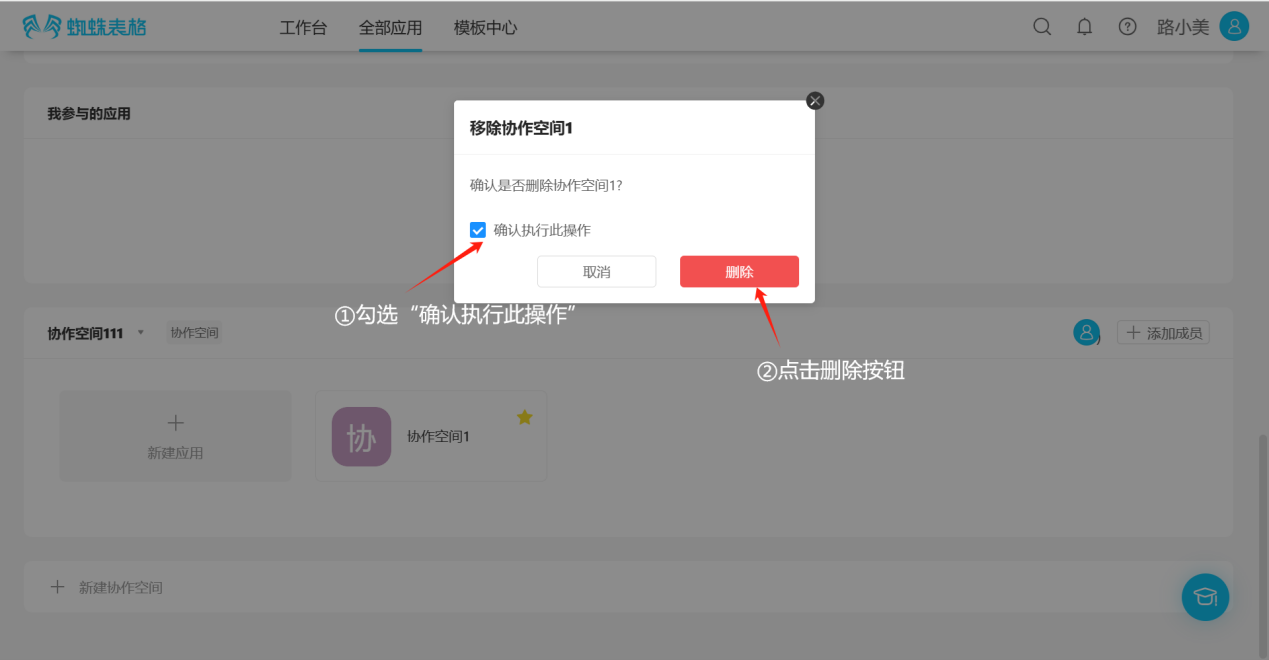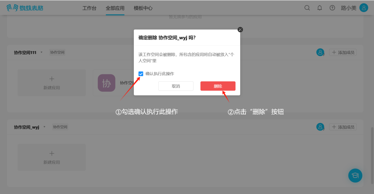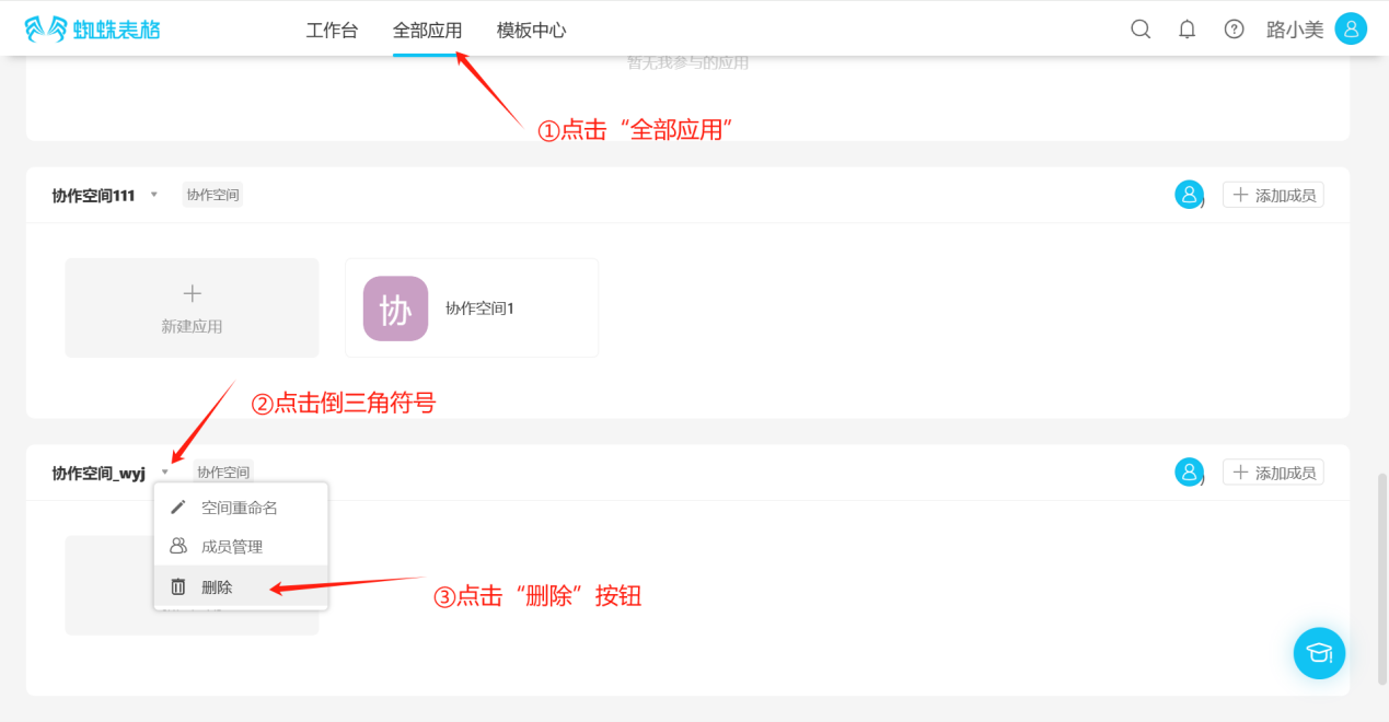 Step 1: Click "All Applications", find the collaborative space to delete, click the inverted triangle symbol to the right of the space name to open the edit list, then click the "Delete" button to open the delete confirmation dialog.