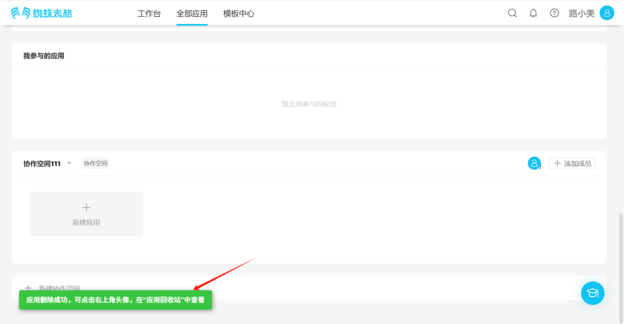 Step 3: The message "Application deleted successfully, you can click the avatar in the upper right corner to view in 'Application Recycle Bin'" indicates successful deletion.