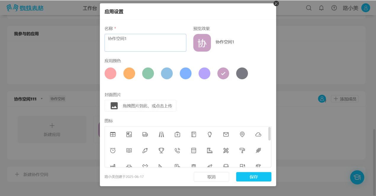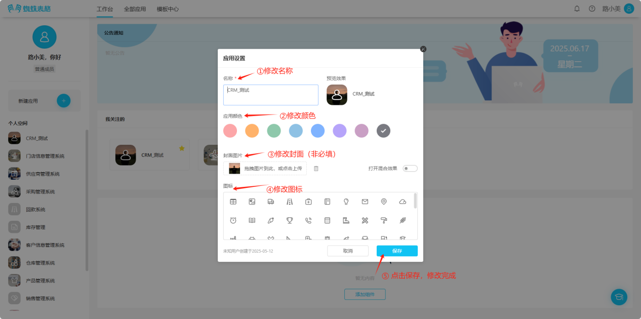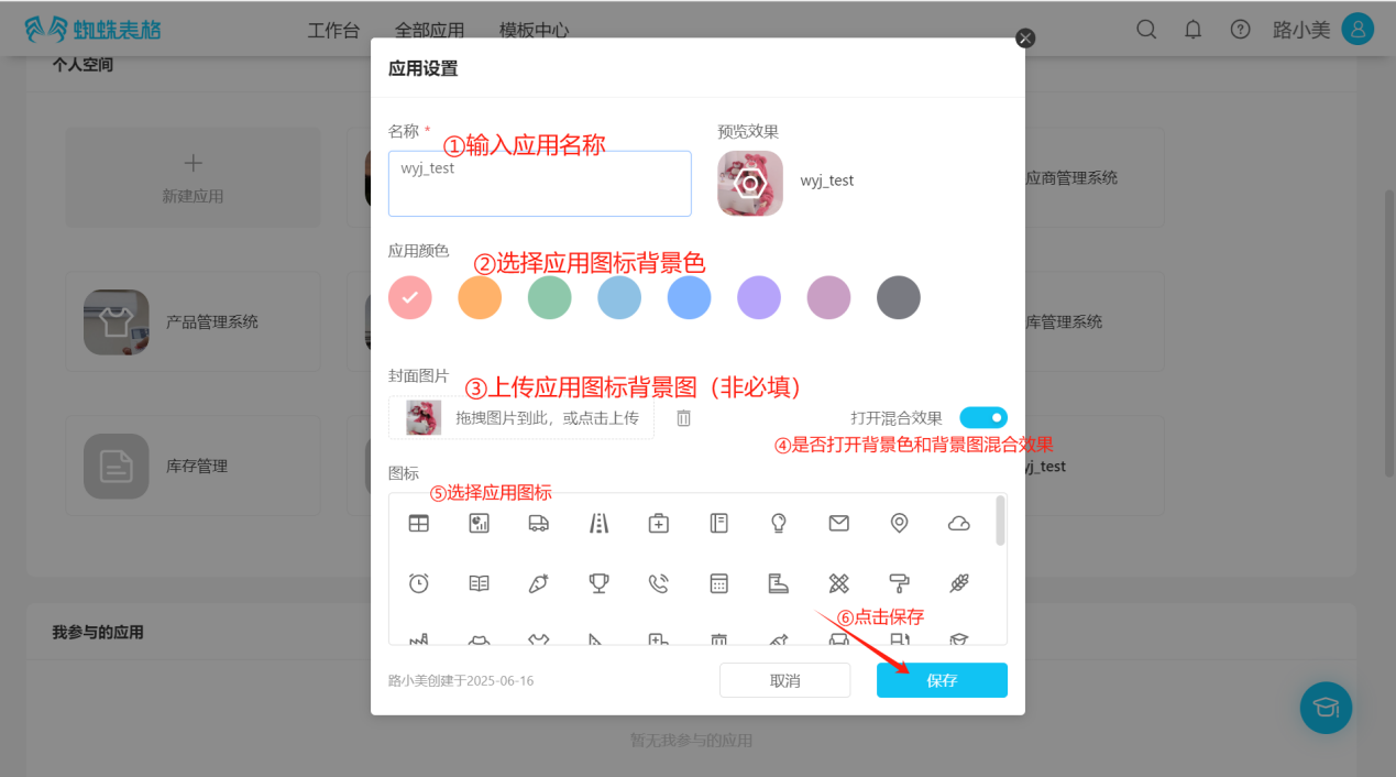 Step 3: In the "Application Settings" popup page, enter or select the application's name, color, icon, etc., and select "Save" to successfully create the application.