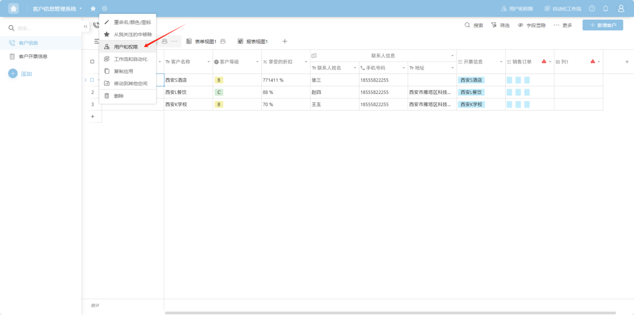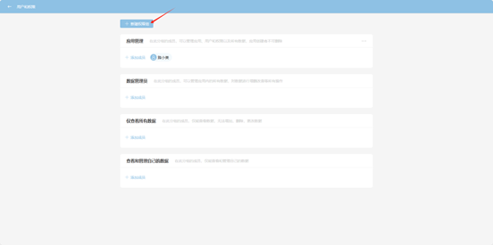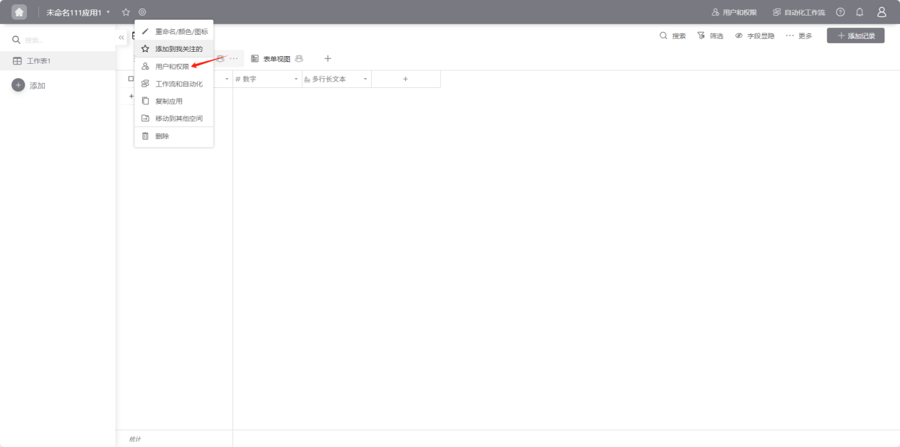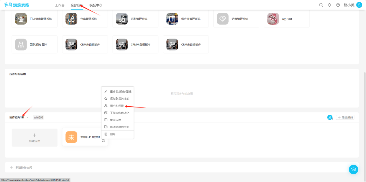 - From the workspace left application list or application cards under all applications, enter the application you want to set permissions for, click "Users and Permissions" in the upper right corner to enter the permissions settings page.