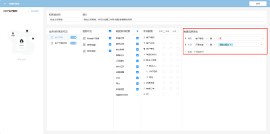Step 6: The data filtered by the filter conditions is the range of data rows that users in this permission group can operate on, i.e., when a certain field meets certain conditions. Multiple filter conditions are applied simultaneously. After completing the settings, click "Save" to take effect.