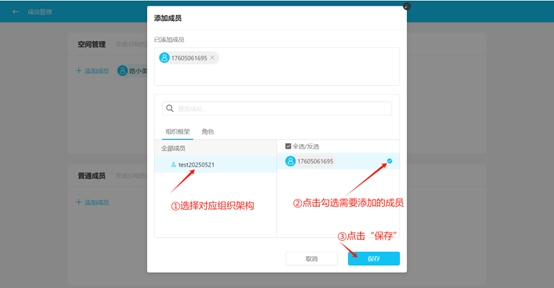 Step 3: In the "Add Member" popup, batch select members according to "Organizational Structure" or "Role", then click Save. (You can also search for members using the search box)