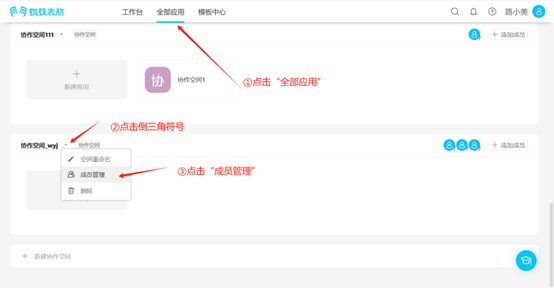 Step 1: Click the inverted triangle symbol to the right of the collaborative space name, open the edit list, click "Member Management", open the member management page.