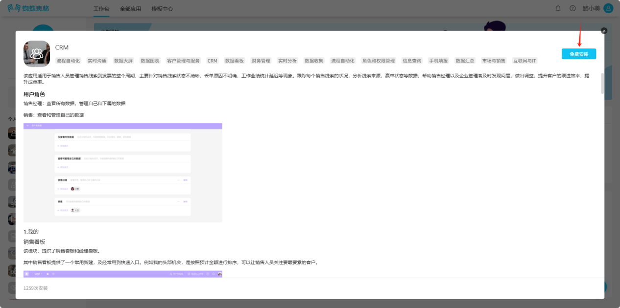 Step 2: In the popup window, view the detailed introduction and illustrations of the template, confirm whether it matches your needs, and then select "Free Install"