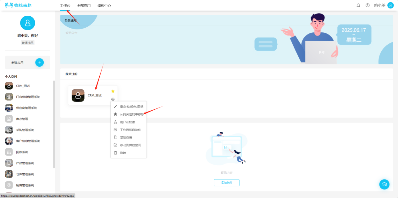 - All Applications → Personal Space → Click the "★" in the upper right corner of the application to remove from favorites, the icon will change from "★" to "☆", or click the "