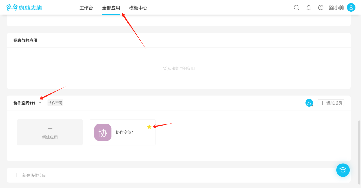 Under "All Applications", spaces with the "Collaborative Space" label are collaborative spaces.