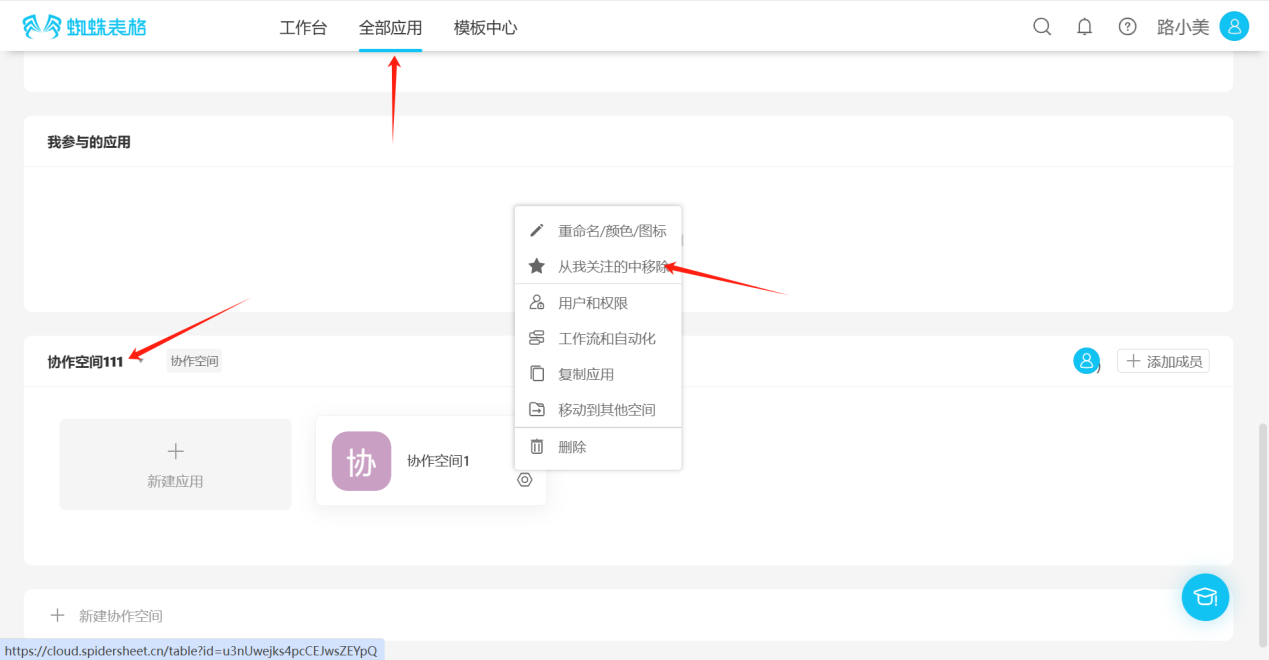- All Applications → Collaborative Space → Click the "★" in the upper right corner of the application to remove from favorites, the icon will change from "★" to "☆", or click the "