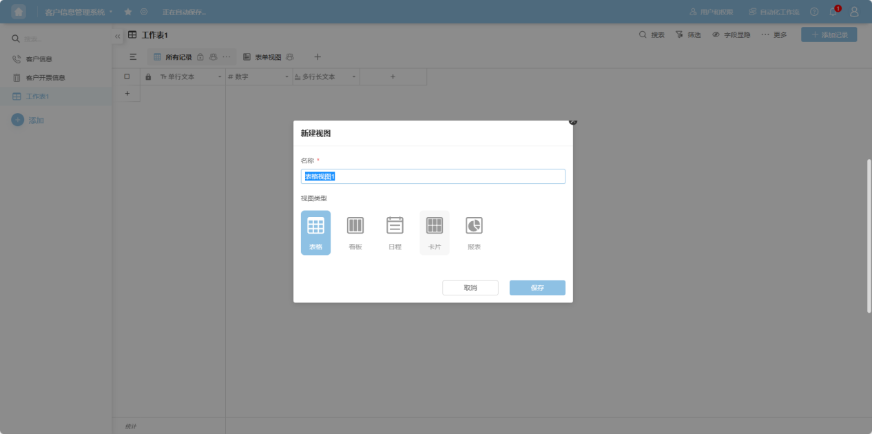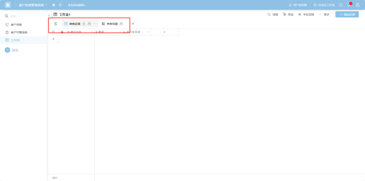 Newly created worksheets come with a default table view (for all records) and a form view. The table stores basic structured data in a row-and-column format, while the form is used to collect data for the table.