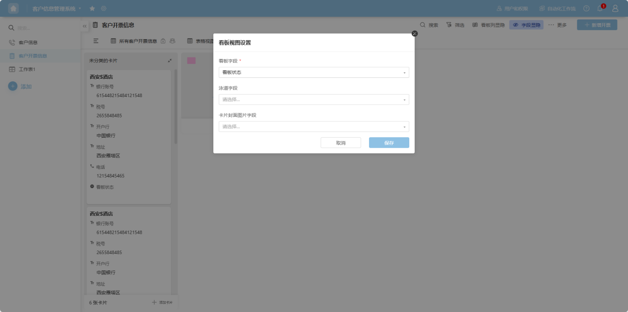 Step 4: In the pop-up window, configure the Kanban Field, Lane Field, and Card Cover Field. The Kanban and Lane fields will automatically display statistics based on any status value in the table.